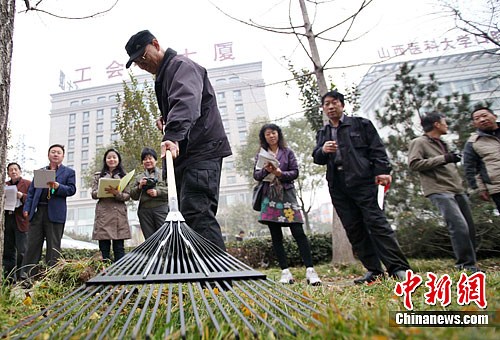 11月16日,山西太原園林綠化隊職工匯聚新建路,各負責一段綠化帶,展開園藝技能大比武,以競賽形式調動綠化養護職工的積極性。